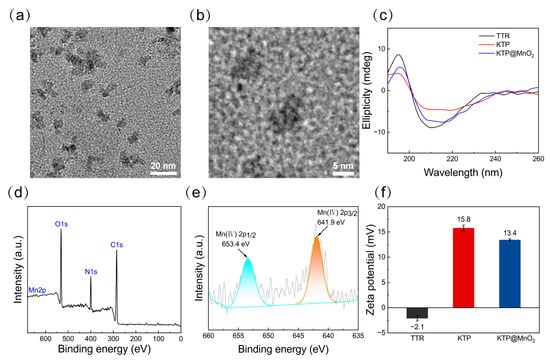 KTP was constructed by fusing TTR with KLVFF at the N-terminal and Pen at the C-terminal. KTP was chosen for subsequent experiments based on pre-experimental findings, demonstrating its superior efficacy compared to KLVFF-TTR in inhibiting Aβ aggregation and theoretical considerations, suggesting that KTP possesses the ability to target Aβ in a manner not achievable by TTR-Penetratin (Figure S1). For the expression of TTR and KTP protein, recombinant vectors pCold II-TTR and pCold II-KTP were constructed and transformed into the Escherichia coli BL21 (Figure S2a,b). The purified TTR was composed of monomers (~15 kDa) and dimers (~35 kDa) (Figure S2c), and KTP contained monomers (~20 kDa) and dimers (~45 kDa) (Figure S2d). It has been demonstrated that both TTR monomers and dimers could bind to Aβ species [49], therefore, proteins utilized in the following fabrication experiments were the mixtures of monomers and dimers. As shown in Figure 1, KTP solution was first mixed with manganese chloride (MnCl2), and then the composites of KTP and MnO2 nanoclusters were formed by a biomineralization process under alkaline conditions [44,50], which were designated as KTP@MnO2. KTP@MnO2 was relatively uniform with an average size of approximately 8 nm (Figure 2a), and it contained several MnO2 nanoclusters with a size of about 1 nm (Figure 2b). The conformations of different inhibitors were determined by CD spectroscopy (Figure 2c). TTR presented β-sheet conformation with a negative peak near 216 nm and a positive peak before 200 nm, which is consistent with the literature [51]. KTP presented α-helix conformation with double negative peaks at 220 nm and 208 nm, and a positive peak before 200 nm. KTP@MnO2 maintained a conformation similar to KTP, but the content of secondary structures changed. The increase in the negative ellipticity of KTP@MnO2 around 220 nm and 208 nm indicated the increase in α-helix content. The elemental composition and valence distribution were investigated by XPS survey (Figure 2d,e). The XPS full scan spectrum showed that KTP@MnO2 was mainly composed of C, N, O, and Mn elements (Figure 2d). Moreover, the high-resolution Mn2p XPS spectra of KTP@MnO2 showed two peaks at 641.9 and 653.4 eV (Figure 2e), which corresponded to the characteristic peaks of Mn2p in MnO2, indicating the successful synthesis of KTP@MnO2. The ζ-potential of TTR was −2.1 mV, and it was increased to 15.8 mV for KTP (Figure 2f) due to the introduction of positively charged KLVFF and Pen [38,52]. Notably, due to the negatively charged MnO2, the ζ-potential of KTP@MnO2 decreased to 13.4 mV [53].