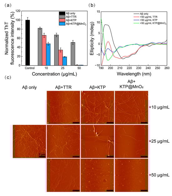 A ThT fluorescence assay was employed to examine the inhibitory efficiency of various inhibitors, since ThT dyes can bind to the β-sheet structure of Aβ species and exhibit enhanced fluorescence signal. As observed in the aggregation kinetics of Aβ40 (Figure S3), Aβ40 fibrillization exhibited a sigmoidal curve with a distinct lag period (nucleation phase). Normalized ThT fluorescence intensity after 160 h co-incubation obtained from the kinetic curve of Aβ40 in Figure S3 was presented in Figure 3a. TTR, KTP, and KTP@MnO2 inhibited Aβ40 fibrillization in a concentration-dependent manner, as evidenced by the decreased ThT fluorescence intensity in the plateau phase. TTR inhibited the 18%, 33%, and 49% ThT fluorescence intensity of Aβ40 at 10, 25, and 50 μg/mL, respectively. In comparison, KTP possessed a stronger inhibitory capability than TTR, reducing ThT fluorescence intensity by approximately 34%, 66%, and 100% at 10, 25, and 50 μg/mL, respectively. Remarkably, KTP@MnO2 showed the most potent inhibitory capability, completely inhibiting the aggregation of Aβ40 at 50 μg/mL, and suppressing about 52% and 81% ThT fluorescence intensity at 10 and 50 μg/mL. The inhibitory capability of KTP@MnO2 was significantly stronger than that of human serum albumin (HSA), an Aβ-binding protein, which reduced ThT fluorescence intensity by 20% at 0.5 μM (33.3 μg/mL). Furthermore, KTP@MnO2 demonstrated greater inhibition compared to the nanocomposite formed by the combination of HSA and MnO2 (25 μg/mL and 50 μg/mL of HSA@MnO2 inhibited 64% and 72% of ThT fluorescence intensity, respectively) [48]. It is considered that the high inhibitory capability of KTP was attributed to the introduction of positively charged and hydrophobic KLVFF and Pen, which enhanced the electrostatic and hydrophobic interactions between KTP and Aβ40. This inference was corroborated by isothermal titration calorimetry assay (Figure S4). The ΔG values for the binding of TTR and KTP to Aβ40 were determined to be −36.83 and −48.43 kJ/mol, respectively, signifying the spontaneous nature of their binding events with Aβ40. Furthermore, the ΔG and Kd values between KTP and Aβ40 were calculated to be smaller than those of TTR, suggesting a stronger binding affinity between KTP and Aβ40. In addition, it is considered that the introduction of MnO2 nanoclusters could stabilize the conformation of KTP, resulting in robust inhibitory capability. The lag time (Tlag) obtained from the kinetic curve of Aβ40 in Figure S3 is listed in Table S1. It can be seen that Tlag increased with the addition of TTR, which was attributed to TTR being able to affect the primary nucleation and secondary nucleation of Aβ40 by binding to Aβ40 oligomers [31]. Tlag became shorter with the addition of KTP, indicating KTP could accelerate nucleation and promote the early aggregation of Aβ40 [32,54]. However, the Tlag of KTP@MnO2 was longer than that of KTP, suggesting that the introduction of MnO2 can extend the Tlag [48].