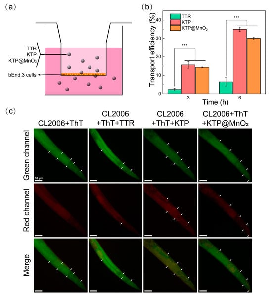 (a) Schematic representation of inhibitors crossing the BBB model. (b) Quantitative analysis of the BBB penetration efficiency of TTR, KTP, and KTP@MnO2. Statistical significance level was expressed by asterisk (in comparison with the TTR group, *** p < 0.001). (c) In vivo targeting capability of different inhibitors. C. elegans were stained with Aβ-specific probe ThT (green emission) and incubated with Cy5-labelled inhibitors (red emission). Scale bars are 50 μm. The amyloid plaques were marked by white arrows.