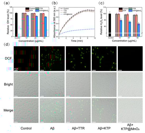 Moreover, H2O2 was found to be scavenged by KTP@MnO2 in vitro. As depicted in Figure 5c, KTP@MnO2 at 50 μg/mL reduced the H2O2 level by more than 15%, whereas TTR and KTP lowered the H2O2 level by less than 3%, highlighting the superior H2O2 scavenging activity of KTP@MnO2. Overall, the in vitro ROS scavenging activity of KTP@MnO2 was satisfactory, with the ability to eliminate ·OH, ·O2−, and H2O2, holding the promise to scavenge free radicals in the protein aggregation process.