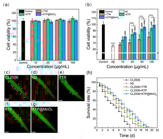 Thus, KTP@MnO2 with Aβ targeting and inhibition, BBB penetration, and multiple ROS scavenging activities hold exciting promise for efficient and multi-target treatment of AD. The therapeutic effect of KTP@MnO2 in cells and nematodes will be showcased in the following section.