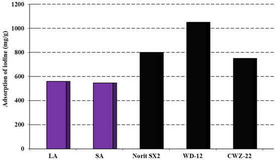 The analysis of the data presented in Figure 3 suggested that the obtained activated carbons had the ability to remove inorganic contaminants with sizes similar to the iodine molecule. From the results obtained, it can be concluded that these activated carbons showed similar sorption capacities towards aqueous iodine solutions. By analyzing the data in both Figure 3 and Table 2, it was concluded that the size of the specific surface area and the starting material influenced the amount of iodine adsorbed on the obtained carbon adsorbents. The most efficient adsorbent was found to be that produced through the chemical activation of coal sourced from the Labin colliers using sodium hydroxide. This coal exhibited a sorption capacity of 556 mg/g. The LA sample demonstrated a slightly lower sorption capacity of 546 mg/g. However, the activated carbons obtained had considerably lower sorption capacities for iodine when compared to commercially available carbons on the market. Carbons such as Norit SX2 and WD-12 possess a more developed specific surface in contrast to the LA and SA samples, which undoubtedly contributes to their sorption capacity [20]. Therefore, future research should concentrate on producing carbon adsorbents with significantly enhanced specific surface areas and porous structures.