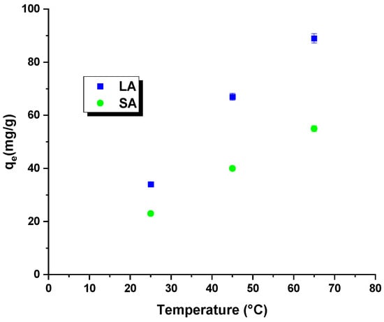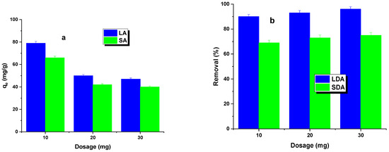 The first phase of the adsorption study investigated the effect of the activated carbon dosage on the dye removal efficiency. The results of these studies are shown in Figure 4. It was found that, as the dosage of the LA and SA samples increased, a decrease in the adsorption capacity was observed, while the percentage of dye removal increased. The sorption capacity decrease was more significant for LA carbon. Increasing the carbon dosage led to a larger contact area, resulting in more active sites capable of adsorbing the dye [23]. This led to a percentage increase in dye removal for both types of activated carbon. However, increasing the adsorbent dosage from 20 to 30 mg resulted in only a minimal increase in the dye removal efficiency, regardless of the type of activated carbon used. Therefore, an adsorbent dosage of 20 mg was adopted for further studies.