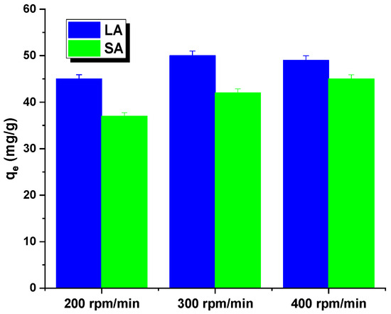 The rate of shaking of the samples may have also impacted the interpretation of the results. Figure 5 shows that both the adsorbents had an identical relationship. The sorption capacity for the aqueous rhodamine B solution increased as the shaking speed increased from 200 to 300 rpm. This may have been due to a decrease in the thickness of the boundary layer around the carbon particles, caused by an increase in the mixing rate. While shaking the mixture, the activated carbon particles moved rapidly in the solution, leading to an increase in the concentration of rhodamine B in the vicinity of the adsorbent surfaces that potentially reached the total concentration. However, at shaking speeds exceeding 400 rpm, the diffusion rate decreased. This could have been due to the high shaking speed providing enough additional energy to break the newly formed bonds between rhodamine B and the activated carbon surface [16]. Further adsorption studies were conducted for the samples at a shaking speed of 300 rpm.