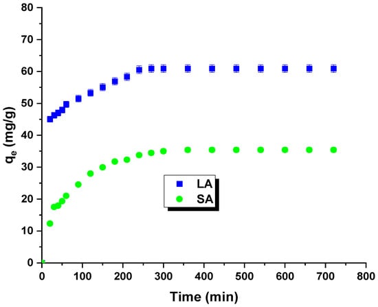 Figure 6 shows the results of the kinetic studies. The isotherms allowed for the determination of the optimal time for the adsorption process. The time of formation of the adsorption equilibrium corresponds to the highest removal efficiency for rhodamine B. The curves indicate a rapid increase in the sorption capacity with contact time. The equilibrium state was achieved after 240 min. The maximum sorption capacity for the LA carbon was experimentally determined to be 60 mg/g, and for the SA sample, it was 35 mg/g. The initial increase in the sorption capacity can be attributed to the enhanced contact potential between the dye molecules and the synthesized adsorbents [25].