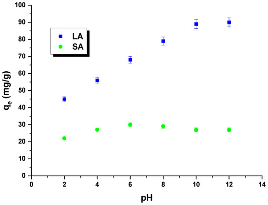 Rhodamine B is an alkaline dye that exhibits different forms depending on the pH of the solution. At a pH below 3.5, the dye molecules are present in a monomeric form, while at a pH equal to or greater than 3.5, they assume a dimeric form. In this context, H+ ions can compete with dye cations, and OH− groups can compete with dye anions. The impact of the pH of rhodamine B solutions on the sorption capacity was investigated for the obtained samples (Figure 8). The pH of the dye solution ranged from 2 to 12. It was observed that the quantity of rhodamine B adsorbed on the LA carbon increased as the pH of the dye solutions increased. This can be attributed to the electrostatic interactions between the negatively charged surface of the LA sample and the dye molecules. The sorption capacity of SA carbon was found to only slightly increase when the pH of the dye solution was increased from 2 to 6. However, when the pH was further increased from 6 to 12, the sorption capacity decreased. It is important to note that the changes in sorption capacity over the studied pH range were minimal. This was likely due to the fact that the carbon had only acidic groupings on its surface, which did not interact with the dye molecules. As a result, this sample exhibited low sorption capacities [29].