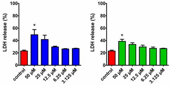 The effects of 5 (blue) and 7 (green) on LDH release from HeLa cells. The cells were treated with compounds at a concentration range of 3.125–50 μM for 24 h at 37 °C and 5% CO2. Data are presented as the mean LDH release (%) ± SD of two experiments compared to untreated control (red). Statistical significance measured by two-way analysis of variance (ANOVA) is indicated by asterisks: (*) p < 0.05.