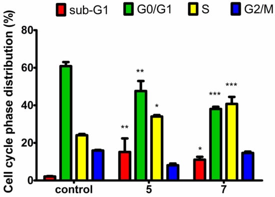 Effects of 5 and 7 on cell cycle phase distribution in HeLa cells compared to untreated control. The cells were treated for 24 h at 37 °C and 5% CO2 with compounds at a concentration corresponding to their IC50 values. Data are expressed as mean ± SD of two independent experiments. Statistical significance in comparison with the untreated control, measured by two-way analysis of variance (ANOVA) followed by Bonferroni multiple comparison test, is indicated by asterisks: (*) p < 0.05, (**) p < 0.01, (***) p < 0.001.