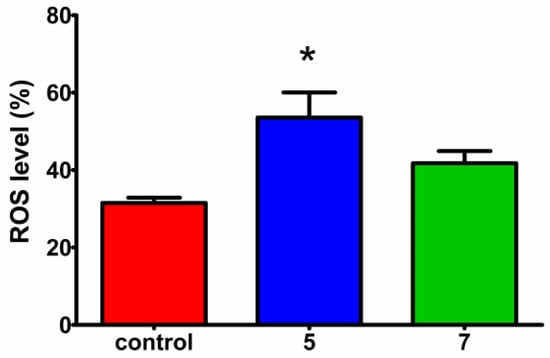 Intracellular ROS generation in HeLa cells after treatment with 5 (blue) and 7 (green) for 24 h at 37 °C and 5% CO2. The concentration for each compound corresponded to the IC50 values. Oxidative stress was evaluated using H2DCFDA by flow cytometry. Data are expressed as the mean ± SD of two experiments. Statistical significance in comparison with the untreated control, measured by two-way analysis of variance (ANOVA) followed by Bonferroni multiple comparison test, is indicated by asterisks: (*) p < 0.05.