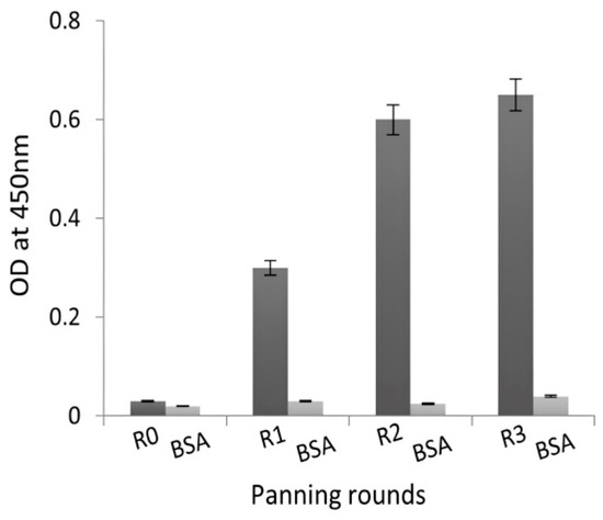 An aliquot of the library covering a representative sample of the recombinant VHH bank was phage-displayed after being rescued by M13KO7 helper phages. The three rounds of panning on the immobilized NDM-1 enzyme enriched phage particles expressing antigen-specific Nbs. The number of input phages was 1012 in the first round and 109 in the second and third rounds. As expected, the consecutive rounds of selection gradually increase the fraction of NDM-1-specific phages [25]. In addition, the dual use of purified NDM-1 and increasing stringency during the consecutive in vitro washings directed the likelihood of selecting target-specific binders. Specifically, the number of washes increased from 10 in the first round, to 15 in the second round, and 20 in the third round. The enrichment of clones expressing antigen-specific Nbs during second and third rounds of biopanning is illustrated by the results of a polyclonal phage ELISA performed on phages eluted after each round of biopanning (Figure 1).