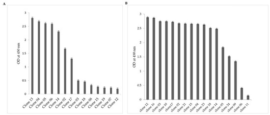 Forty-eight individual colonies from second and third rounds of panning were randomly selected, and VHH expression was induced with IPTG, leading to the accumulation of Nbs in the bacterial periplasm. Periplasmic extracts obtained from individual colonies were then tested using ELISA to detect NDM-1-specific binders. Out of 48 clones, 17 extracts did not yield a significant signal. Interestingly, 31 extracts exhibited a strong signal in ELISA, reaching at least 4× the background signal and reflecting a combination of high affinity and/or a good production yield (background signal from 0.02 to 0.5 OD/mL) (Figure 2A,B). Each produced extract was tested in duplicate wells.