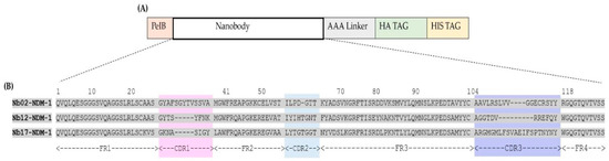 The nanobody sequences of 31 clones that scored positive in ELISA were aligned (Figure 3) and numbered according to ImMunoGeneTics numbering (IMGT) [26] and grouped into three distinct clusters based on the homology of their CDR3, indicating that there are three unique sequences among the 31 duplicate clones. Notably, each of these unique sequences was approximately represented 10 times. These Nbs are referred to as Nb02NDM-1 (Figure 2A), Nb12NDM-1, and Nb17NDM-1 (Figure 2B). It has been reported that the CDR3 of Nbs constitutes 60–80% of the antigen contacting area [27], and that a synthetic peptide derived from CDR3 (peptibody) preserves measurable affinity and specificity to antigen [28]. Furthermore, the three selected Nbs originated from an independent B-cell lineage, as they share a low degree of sequence identity and have a different CDR3 length. The length of the CDR3 is from 12 to 21 amino acids among the selected Nbs, and Nb17NDM-01 has the longest CDR3 of all.