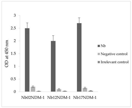 An ELISA was then carried out to evaluate the binding capacity between 5 × 10−3 µg/mL of the purified Nbs and 1 µg/mL of the NDM-1 enzyme. As shown in Figure 4, all three Nbs showed positive interactions with the recombinant enzyme. Indeed, the absorbance values at OD450 nm are at least more than 10-fold higher than those of both the negative controls (OD not exceeding 0.2) and the irrelevant control (scorpion toxin BotI), indicating the strong binding and specificity between Nbs and NDM-1. Interestingly, Nb12NDM-1 was slightly less effective to bind NDM-1 at equilibrium, compared to Nb02NDM-1 and Nb17NDM-1.