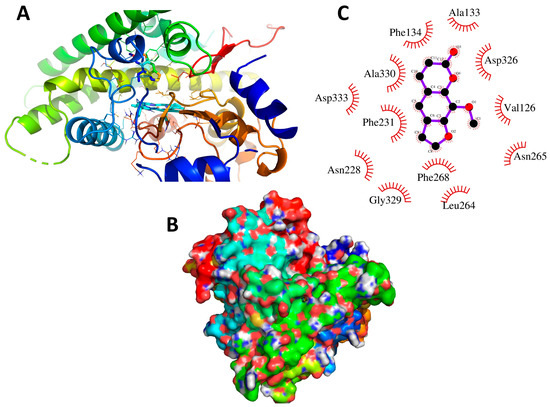 Binding site interactions of 8-MP with CYP1B1, drug, and the binding pocket of the enzyme are shown as tube model while interacting amino acid residues are shown as stick model (A); surface representation of the binding cavity occupied by 8-MP (B); residues exhibiting hydrophobic interactions with 8-MP (C).