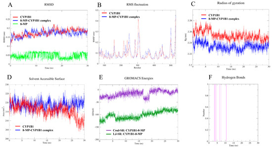 MD simulation (30 ns) analysis of CYP1B1 and 8-MP-CYP1B1 complex. (A) Backbone RMSD of the enzyme, drug-enzyme complex, and the drug. (B) Backbone RMSF per residue number for the enzyme and the complex. (C) Protein radius of gyration for both enzyme and the 8-MP-enzyme complex. (D) Protein SASA of the enzyme and the complex. (E) Coul-SR and LJ-SR interactions energies of the enzyme amino acid residues with 8-MP. (F) The hydrogen bonding profile of 8-MP-CYP1B1 complex.
