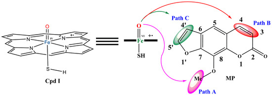 Among the various reactions catalyzed by cytochrome P450 enzymes, O-demethylation is a significant metabolic pathway involved in the biotransformation of numerous drugs, environmental pollutants, and natural compounds [28]. O-demethylation catalyzed by P450 entails the removal of a methyl group from a P450-hydroxylated substrate, typically resulting in the formation of a hydroxyl group [29]. This enzymatic process is pivotal in drug metabolism, as it often leads to the generation of active metabolites or facilitates the detoxification of xenobiotics [29]. However, this metabolic pathway is initiated by the C-H hydroxylation mechanism. Typically, C-H hydroxylation mechanisms initiated by P450 begin with a hydrogen atom transfer from the substrate to the oxo moiety of the P450 compound I (Cpd I) [11]. This is typically the rate-determining step for the majority of C-H hydroxylation mechanisms [30]. Following this, a ferryl hydroxyl porphyrin is formed as an intermediate, with the carbon radical still coordinated to the hydroxyl group of the P450 active site (Cpd I) [30]. Upon formation of the radical intermediate, a rebound of OH from P450 to the hydroxylation site of the substrate leads to the creation of a hydroxylated substrate [11]. 8-MP could undergo C-H hydroxylation at the terminal methyl group at C-8, facilitating the initiation of the MBI of P450 (Figure 3, Scheme 1). The energy profile for this metabolic pathway is shown in Figure 4. Initially, the reactant complex is stabilized by a hydrogen bond between the oxo moiety of Cpd I and the methyl C-H of 8-MP (O...H distance is 2.36 Å for both spin states). The activation energies for the initial H-abstraction are 12.60 and 13.91 kcal mol−1 for doublet and quartet states, respectively. The derived hydrogen transfer transition states exhibit the typical characteristics of H-abstraction transition states [11]. The formation of the radical intermediate (2,4INT-HA) exhibits an endothermic character, with the ground state energies for both HS and LS states being higher than their preceding reactant complex. The newly formed O...•C bond is weak (3.28 and 3.22 Å for LS and HS, respectively), facilitating the rebound of OH to the alkyl radical. The doublet-state rebound process proceeds without a rebound barrier. This outcome, along with the lower LS H-abstraction energy barrier, suggests that this pathway is more likely to proceed via a doublet spin state. These results align with previous findings regarding the hydroxylation of various substrates [28,29]. The energy of the hydroxylated 8-MP (2,4P-OHA) in both doublet and quartet states is lower than that of 2,4RCA by approximately 50 and 60 kcal mol−1, respectively.