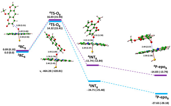 Epoxides are pivotal intermediates in both organic and biosynthetic processes, capable of undergoing a variety of reactions, including nucleophilic substitution and hydrolysis. These reactions often yield a wide array of products [23]. Epoxidation processes involving metal complexes, such as iron-containing metalloporphyrin, are not frequently studied in quantum chemical investigations [31]. Nevertheless, discussions of drug epoxidation reactions involving an oxidant model that simulates the Cpd I active site of P450 do exist [23], including examples like the epoxidation of ethene, propene, 1-butene, and trans-2-butene [32,33]. The epoxidation mechanism generally proceeds in two steps: an initial O attack on the target C=C bond to form a C-O bond, followed by a ring closure step that leads to the formation of the epoxidated substrate (Scheme 1) [34]. Two olefinic double bonds in 8-MP, C3=C4 (Path B) and C4′=C5′ (Path C) are susceptible to epoxidation by P450 (Scheme 1). The energy profiles for these proposed epoxidation pathways, estimated via our quantum chemical calculations, are shown in Figure 5 and Figure 6. The estimated oxygen addition energy barriers (2,4TS-OB) for Path B are 16.03 and 14.32 kcal mol−1 for both HS and LS states, respectively. Conversely, relatively lower rate-determining state energy barriers (2,4TS-OC) were obtained for Path C (13.27 and 13.06 kcal mol−1 for quarter and doublet states, respectively). This finding is particularly intriguing as it suggests a thermodynamic preference for Path C as the prevailing route for the catalyzed biotransformation of 8-MP by P450. In Path C, the effect of solvation (ε = 5.7) led to a slight increase in the transition state energies. This increase is primarily attributed to the enhanced localization caused by the medium polarization effects of the employed solvent (chlorobenzene) [35]. Various bond distance variations during both mechanisms (Path B and C) align with previously reported bond distance variations for the epoxidation mechanism by P450 [23]. Earlier data on the epoxidation of furan revealed a quite negligible rebound barrier for the quartet state and a barrier-free mode for the doublet spin state [23]. In contrast, the ring closure step in our mechanisms proceeds via barrierless routes in both doublet and quartet states. Moreover, the estimated product complexes (2,4P-epo) in both mechanisms exhibit weaker Fe…O distances and are significantly more stable than their preceding reactant complex, particularly in the doublet spin state by approximately 30 kcal mol−1.