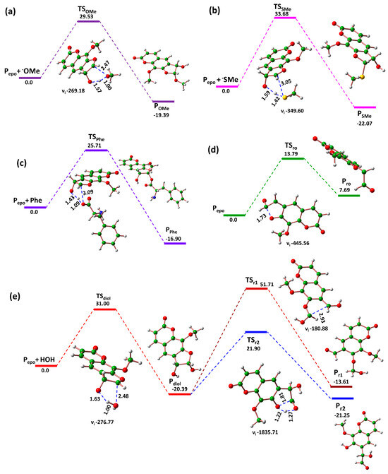 Energy profile in the same conditions of catalyzed biotransformation of 8-MP by P450 and transition state key geometrical features of addition of the nucleophilic residues’ representatives -OMe and −SMe to 8-MP epoxide (a,b), the addition of the significant residue Phe268 to the obtained epoxide (c), autocatalyzed ring opening of the epoxide (d), and epoxide vicinal diol formation and diol degradation to reactive metabolites (e).
