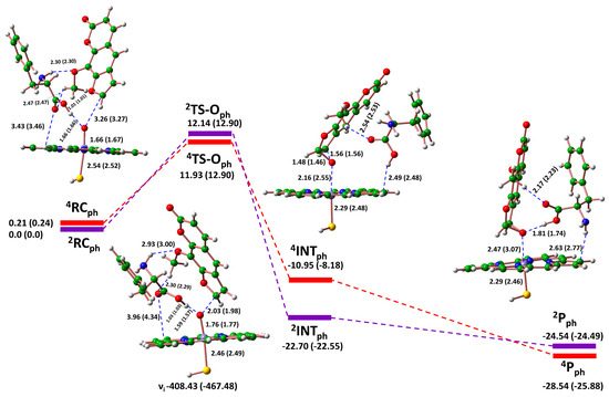 Numerous studies have highlighted the vital catalytic role of phenylalanine residues, particularly Phe134, Phe231, and Phe268, in the binding profile of CYP1B1 with various inhibitors [6,10,39]. These residues have been shown to exhibit energetically favored π–π stacking interactions with many substrates and P450 inhibitors [10]. Our docking and MD simulation analysis results revealed the hydrophobic interactions of these residues with 8-MP in the active site of CYP1B1. Our DFT analysis suggests that the prevailing route for the formation of reactive metabolites that inactivate P450 by forming a covalent adduct is the epoxidation of the five-membered ring of 8-MP. The residue Phe268 was found to be in direct hydrophobic contact with the active C=C bond in 8-MP (Figure 1). Thus, we decided to examine the directing effect of Phe268 on the metabolic epoxidation pathway of 8-MP through DFT analysis (Scheme 1). The energy profile for the epoxidation of the C4′=C5′ double bond in 8-MP, catalyzed by P450 and phenylalanine, is presented in Figure 8. Initially, the reactant complex (2,4RCph) is stabilized by strong hydrogen bonding between the OH of phenylalanine and the O atom of Cpd I (1.66 Å). Simultaneously, the catalytic residue secures the substrate with two polar interactions: one between the NH of phenylalanine and the OMe group of 8-MP (2.30 Å), and another between the methyl group of 8-MP and the carbonyl oxygen of the amino acid (2.47 Å). A weak polar interaction was also observed between the carbonyl oxygen of phenylalanine and a hydrogen atom in the porphyrin ring. Next, the oxygen addition transition states (2,4TS-Oph) displayed the same bonding pattern as the reactant complex, with minor modifications, such as a decrease in the bond distance between the O of Cpd I and the CH of 8-MP, as well as the bond between the carbonyl O and Me of the substrate. The formed intermediates (2,4INTph) and the epoxide product (2,4P-epo) presented different binding profiles with variable bond distances as displayed in Figure 8. In these profiles, the catalytic residues formed one polar bond between its OH group and a carbon atom from the porphyrin ring and another bond between the carbonyl oxygen and the methyl group of 8-MP.