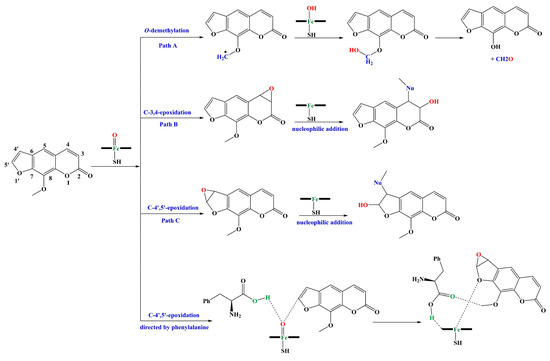 In Scheme 1, we present the possible pathways for the MBI of P450 by 8-MP, which are differentiated by the interaction site in 8-MP susceptible to P450 binding (highlighted in Figure 3). The potential biotransformation routes include O-demethylation of the terminal methyl in C-8 (Path A), epoxidation of the double bond at C3-C4 (Path B), and epoxidation of the double bond at C4′-C5′ (Path C). We also explored the directing energetic influence of phenylalanine residues on the epoxidation pathway in Path C. All proposed biotransformation routes were investigated from an energetic perspective in both doublet and quartet states. Additionally, the reactive metabolites derived from epoxidation products in Path C were also examined further, as depicted in Scheme 2. Figure 4, Figure 5 and Figure 6 present the calculated energy profiles (in kcal mol−1) and key geometrical parameters for Paths A, B, and C at the UB3LYP/B2//B1+ZPE (B1) and UB3LYP (SCRF)/B2//B1+ZPE (B1) levels for both the high spin (HS) and low spin (LS) states of the MBI of P450 by 8-MP at the potential interaction sites in the 8-MP structure.