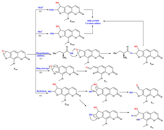 Proposed biotransformation mechanisms for 8-MP epoxide to different metabolites: (a,b) addition of −OMe and −SMe as representative of the active anionic amino acid residues; (c) nucleophilic addition of phenylalanine residue to 8-MP epoxide; (d) direct non-enzymatic ring cleavage of the epoxide; (e) hydrolysis of the epoxidation product and reactive metabolites formation from the obtained diol through ring-opening reactions.