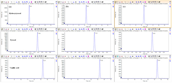 Extract ion chromatograms of the three most abundant polyphenols: (a) standard solution at 50 ng/mL; (b) liquid extract (10,000-fold dilution); (c) encapsulated extract (10,000-fold dilution).