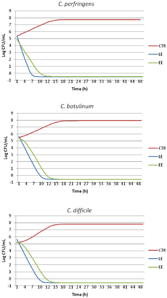 As described in the Clinical & Laboratory Standards Institute (CLSI) guidelines (document M26-A) [54], three broth cultures were set up (105 CFU/mL in Mueller Hinton broth with 5% blood; Biolife Italiana s.r.l., Milan, Italy). The first two broth cultures were respectively added to the EE and LE extracts (1 × MIC), while the third one was used as a growth control (CTRL). The broth cultures were incubated at 37 °C under anaerobic conditions using anaerobic jars (2.5 L AnaeroJar, AG002, together with AnaeroGen 2.5 L, AN0025—Oxoid Limited, Basingstoke, UK). At regular time intervals (0, 4, 8, 12, 24 and 48 h), the count of viable cells was performed. The results are expressed as Log CFU/mL, and in case of no bacterial growth, at the 1.00 Log CFU/mL level (<10 CFU/mL), a value of −0.50 Log CFU/mL was assigned [40]. The experiments were repeated thrice, and standard deviations were determined.