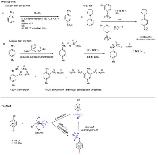 Solely on an unfunctionalized aniline, Mateev [16] and Li [17] have reported that the direct action of sulfuric acid at high temperatures delivers the para-sulfonylaniline. Yur’ev [18] has reported the action of the Py-SO3 complex on 1-phenylpyrrolidine in a 25% yield or the unstable dioxane-SO3 complex in a 61% yield. Kanetani [19,20] studied a para-blocked aniline leading to a complex mixture of sulfamated and variously sulfonated products, under flash vacuum pyrolysis conditions without isolation. Thus, there is much scope for improvement of methods to 1. N-sulfamate aryl molecules and 2. rearrange to the C-sulfonate.