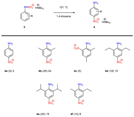 Initial attempts to access 4-aminobenzene sulfonate compounds by thermal rearrangement of 2. The tributylammonium cation is omitted for clarity. Key: percentage conversion as measured by 1H NMR spectroscopy is reported in parentheses, and isolated yield thereafter.