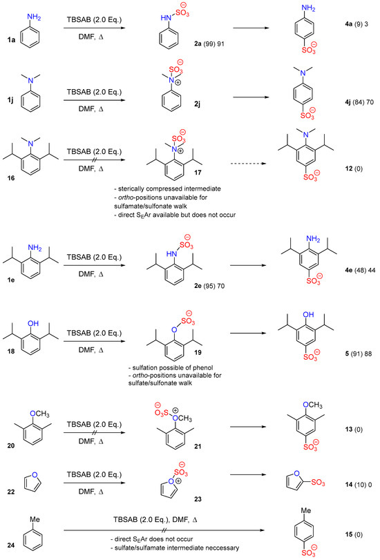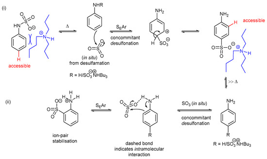 A proposed mechanism for (i) para-sulfonation and (ii) ortho-sulfonation is shown in Scheme 8. Sulfur trioxide is released from the N-sulfamate under thermal conditions, which then undergoes an SEAr intermolecular reaction with the aniline to deliver the para-C-sulfonate product due to steric crowding at the ortho positions due to the tributylammonium cation effect. Upon prolonged high temperature, the para-C-sulfonate can reform aniline and sulfur trioxide in situ.Via intermolecular stabilization, an ortho-C-sulfonate product begins to form once sufficient energy input is reached into the system. With the advent of ohmic heating approaches [45] and alternative routes to ortho-sulfonates [46], this approach offers a mild route to para-sulfonates.