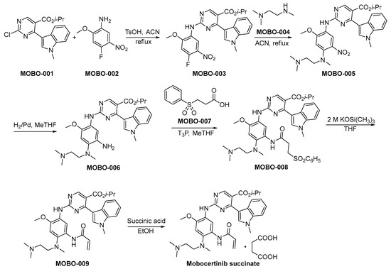 The synthetic method of mobocertinib succinate is shown in Scheme 2 [31]. The compounds MOBO-001 and MOBO-002 are subjected to a nucleophilic substitution reaction, resulting in the formation of MOBO-003. Subsequently, MOBO-003 engages in a nucleophilic substitution reaction with MOBO-004, yielding the synthesis of MOBO-005. The nitro moieties within MOBO-005 undergo hydrogenation and subsequent reduction to amino functionalities employing palladium catalysis, yielding the compound denoted as MOBO-006. The condensation reaction between the amino group and carboxylic acid functional moieties, specifically denoted as MOBO-007 and MOBO-006, respectively, culminates in the formation of MOBO-008. MOBO-008 undergoes a process of elimination when exposed to robust alkaline conditions, resulting in the formation of MOBO-009. The compound MOBO-009 was finally converted to the corresponding succinate.