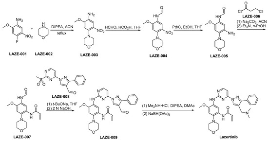 The synthetic strategy employed for the preparation of lazertinib is outlined in Scheme 4 [38]. LAZE-001 undergoes nucleophilic substitution by LAZE-002, leading to the formation of LAZE-003. Subsequently, the amino moiety within LAZE-003 undergoes formaldehyde-mediated transformation, yielding LAZE-004. A reduction of the nitro group of LAZE-004 via hydrogenation using Pd/C as a catalyst provides the corresponding aminoderivative LAZE-005. Following the condensation process, the compound LAZE-005 and the acyl chloride LAZE-006 experience elimination reactions when subjected to alkaline conditions, ultimately yielding the formation of LAZE-007. In the context of alkaline conditions, the compounds LAZE-007 and LAZE-008 engage in a condensation reaction, resulting in the generation of LAZE-009. Subsequently, the aldehyde moiety within the molecular structure of LAZE-009 is subjected to reductive amination, resulting in the synthesis of lazertinib.