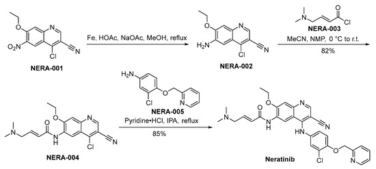 The synthetic methodology employed for the preparation of neratinib is disclosed in Scheme 7. The synthesis of neratinib is initiated through the reduction of NERA-001 employing iron as the reducing agent, yielding the production of NERA-002. Following this, NERA-002 undergoes a condensation reaction with NERA-003, resulting in the synthesis of NERA-004. The chloride moiety within the molecular structure of NERA-004 undergoes displacement by NERA-005, culminating in the synthesis of neratinib [52].