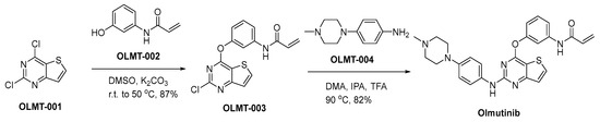 A synthetic approach for the production of olmutinib is delineated within Scheme 9 [64]. The nucleophilic addition reaction of 2,4-dichloro-thieno[3,2-d]pyrimidine (OLMT-001) with N-(3-hydroxyphenyl)-2-propenamide (OLMT-002) is conducted employing potassium carbonate (K2CO3) as a base in dimethyl sulfoxide (DMSO), yielding the diaryl ether OLMT-003. In accordance with specialized reaction conditions characterized by an acid-mediated heating process, the process of introducing piperazinyl aniline OLMT-004 into the synthesis pathway transpires. This reaction necessitates the concurrent presence of dimethyl adipate, isopropanol, and trifluoroacetic acid. This precisely orchestrated sequence culminates in the successful synthesis of the principal compound, known as olmutinib.