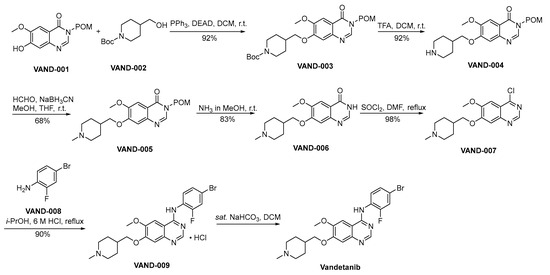 Scheme 12 outlines the preparation methodology employed for the synthesis of vandetanib [77]. VAND-001 and VAND-002 engage in a Mitsunobu reaction, yielding VAND-003 as the resultant product. Subsequently, VAND-003 undergoes a deprotection process involving the removal of the Boc protective group from amino moieties, executed under acidic conditions, thereby affording the formation of VAND-004. The amino moiety residing within VAND-004 is subjected to a reduction amination process catalyzed by formaldehyde, yielding the formation of VAND-005. VAND-005 facilitates the deprotection of the POM protective group through a reaction conducted in the presence of methanolic ammonia. This process yields VAND-006 as the resultant product. VAND-006 undergoes a chlorination process catalyzed by thionyl chloride, resulting in the formation of VAND-007. VAND-007 and VAND-008 engage in a nucleophilic substitution reaction, resulting in the formation of VAND-009. Subsequently, VAND-009 undergoes an alkaline treatment process, ultimately affording the synthesis of vandetanib.