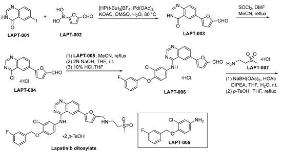The initiation of lapatinib ditosylate synthesis is instigated through a Suzuki coupling reaction involving the precursors LAPT-001 and LAPT-002. This catalytic event engenders the formation of an intermediate compound LAPT-003, as comprehensively explicated within Scheme 13. Subsequent to the preceding step, the chlorination of LAPT-003 is conducted employing a reagent system composed of SOCl2 and DMF within a refluxing acetonitrile medium. This procedure yields the compound LAPT-004 [82]. Subsequent to the initial step, the chlorinated functional group residing in LAPT-004 is subjected to a substitution process with LAPT-005, resulting in the formation of LAPT-006. The ultimate stage in the synthetic route entails the reductive amination process of LAPT-006 and LAPT-007, subsequently subjecting the resultant compound to treatment with para-toluenesulfonic acid (p-TsOH), leading to the conclusive formation of lapatinib ditosylate.