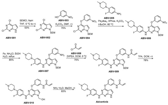 The preparation procedure for abivertinib is presented in Scheme 16 [94]. ABIV-001 is subjected to a safeguarding process employing SEM protective group under conditions of strong alkalinity, leading to the generation of ABIV-002. ABIV-002 and ABIV-003 partake in a nucleophilic substitution process, resulting in the generation of ABIV-004. Subsequently, ABIV-004 experiences a nucleophilic substitution reaction with ABIV-005, affording the ABIV-006. ABIV-006 undergoes reduction to form ABIV-007, which then reacts with acryloyl chloride ABIV-008 through condensation to produce ABIV-009. The deprotection of the SEM safeguarding moiety in ABIV-009 is achieved via acidic conditions, thereby affording the formation of hydroxyl functionalities, thereby yielding ABIV-010. ABIV-010 undergoes a hydroxymethyl group elimination process mediated by ammonia, ultimately leading to the successful synthesis of abivertinib.