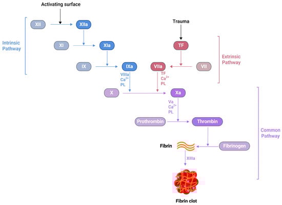 Similarly, another type of pathway exists in the coagulation cascade, known as the intrinsic or contact pathway (Figure 1). When damaged cell surfaces are in contact with high-molecular-weight plasma proteins, such as kininogen and kallikrein, the activation of factor XII (FXII) to factor XIIa (FXIIa) takes place, followed by further downstream conversions of factor XI (FXI) to factor XIa (FXIa), and factor IX (FIX) to factor IXa (FIXa) [24]. The activated FIXa forms a complex with factor VIIIa (FVIIIa) to produce intrinsic tenase complex FVIIIa:FIXa, which activates FX to FXa [25]. Independent of the extrinsic or intrinsic pathway, once FXa is released in the coagulation cascade, it forms a 1:1 ratio complex, prothrombinase, with factor Va (FVa), calcium ions, and phospholipid. Prothrombinase converts prothrombin to thrombin, resulting in the thrombin-mediated cleavage of fibrinogen to fibrin. Prothrombinase production and the subsequent thrombin and fibrin creation steps are described as the common pathways in the coagulation cascade (Figure 1) [25]. The final product of this common pathway (i.e., fibrin) plays a crucial role in creating a polymer fibrin gel. Then, factor XIIIa (FXIIIa), activated by thrombin, covalently crosslinks loosely bound fibrin gel, forming insoluble fibrin clots with platelets [25,26].