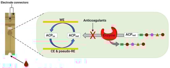 Similarly to the case of thrombin, monitoring FXa activity is another viable method for quantifying anticoagulants. This was confirmed by our group; by using a disposable gold co-facing recycling electrode system, an FXa enzyme-based POC assay was demonstrated for DOACs involving rivaroxaban, edoxaban, and LMWHs, such as enoxaparin and dalteparin [58]. The working principle of this sensor is similar to that described in Figure 3. The enzymatic reaction releases the ACP in the presence of the FXa-specific substrate Cbz-D-Arg-Gly-Arg-ACP peptide. However, when FXa inhibitors are present, they readily inactivate the FXa enzyme, leading to a proportional decrease in the measured amperometric current. Therefore, the measured amperometric current is related to the activity of FXa, which, in a reciprocal relationship, is influenced by the presence of the FXa inhibitor within the solution. This sensor can detect ≥ 9.00 ng mL−1 of rivaroxaban and quantify it within the 11.0–140 ng mL−1 range. In addition, the lower detection limit for edoxaban is 12.9 ng mL−1, and the quantification range is in the 16.8–140 ng mL−1 range. Likewise, enoxaparin and dalteparin (two LMWHs) were also quantified using the same sensor. A concentration ≥ 0.016 IU mL−1 of enoxaparin was detected, showing a quantification range of 0.025–0.75 IU mL−1. Meanwhile, the dalteparin detection limit was 0.013 IU mL−1, and the quantification range was 0.019–0.75 IU mL−1. With a rapid assay completion time of less than 30 s, requiring only a minimum sample volume of 7 μL, and the ability to operate at a physiological pH without calibration, this sensor is a potentially helpful candidate for POC testing.