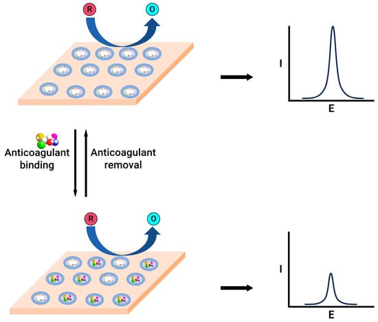 Similarly, the interaction between protamine, a heparin antidote, and heparin was evaluated using a gold-decorated graphene oxide glassy carbon electrode system [83]. This sensor utilises a probe ion system such as [Fe(CN)6]3−/4−; upon the binding of heparin to protamine, the decrease in the peak current was correlated to an increase in the heparin concentration. The linear range of heparin quantification was between 1.59 nM and 19 µM with a 0.9 nM low detection limit. A molecularly imprinted polymer grafted onto the graphite paste electrode surface was also presented [101]. The incorporated particles were extensively blended with oil to produce the molecularly imprinted polymer–graphite paste electrode. Standard cyclic voltammetry was conducted using the electrode in saline buffer or bovine whole blood, incorporating 5 mM of ferrocyanide, which showed a linear quantification of heparin ranging from 0 to 10.7 µM. The current intensity rose in tandem with the concentration of heparin, which was attributed to the enlargement in the effective surface area caused by the increased mobility of the oil in the molecularly imprinted polymer–graphite electrode facilitated by heparin.