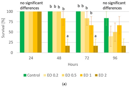 Percentage of live Leptinotarsa decemlineata Say females (a) and males (b) after the application of EOTO. Control—redistilled water; EO 0.2—EOTO in the concentration of 0.2%; EO 0.5—EOTO in the concentration of 0.5%; EO 1—EOTO in the concentration of 1%; EO 2—EOTO in the concentration of 2%. The means for individual dates of observations marked by different letters are statistically different (p ≤ 0.05). Where letters are not presented, no significant differences were found.