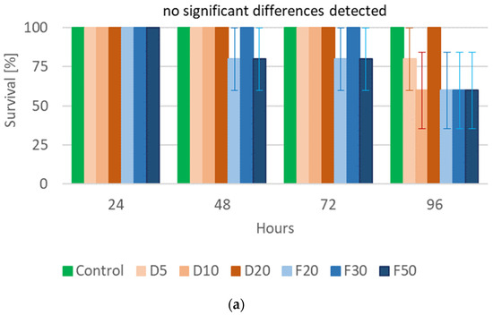 Percentage of live Leptinotarsa decemlineata Say females (a) and males (b) after the application of WETOs. Control—redistilled water; D5—WETO from dry matter in concentration of 5%; D10—WETO from dry matter in concentration of 10%; D20—WETO from dry matter in concentration of 20%; F20—WETO from fresh matter in concentration of 20%; F30—WETO from fresh matter in concentration of 30%; F50—WETO from fresh matter in concentration of 50%. The means for individual dates of observations marked by different letters are statistically different (p ≤ 0.05). Where letters are not presented, no significant differences were found.