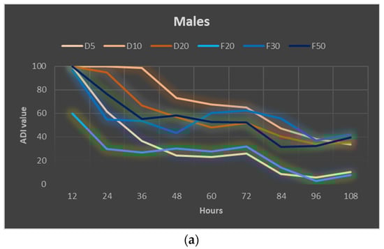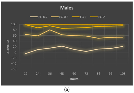 The calculated ADI index for males reached positive values in almost every case, indicating the inhibitory effect of the used EOTO concentrations on their foraging (Figure 4a). The values of this index were higher the higher the concentration of EOTO and remained at a similar level in a given treatment throughout the experiment. The deterrent effect of EOTO in the case of females became apparent only at higher concentrations, i.e., 1% and 2%. EOTO concentrations of 0.2% and 0.5% even caused ADI to reach negative values during the initial period of the experiment, indicating an increase in the attractiveness of food treated with these EOTO concentrations. Over time, however, this effect faded. A comparison of the two sexes for 1% EOTO shows significantly higher ADI values for males (between 85 and 98; average 91) than for females (between 18 and 57; average 47) (Figure 4a–c). EOTO, at a concentration of 2%, caused complete inhibition of foraging in both females and males. Analysis of mean ADI values (Figure 4c, Table S12) confirmed the trends described above, i.e., significant differences between concentrations of 0.2%, 0.5%, and 1% for males and no significant differences between treatments where 0.2% and 0.5% EOTO were used for females.