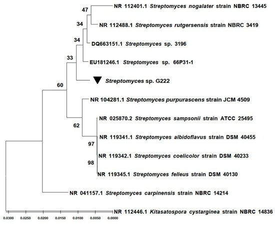 The taxonomy of the strain G222 was identified using a 16S rRNA gene sequence. Gene sequences were handled with BioEdit v.2.7.5. and compared with 16S rRNA gene sequences in the GenBank database using the NBCI Blast program. The results showed that strain G222 belongs to the Streptomyces genus. It showed 99.58% identity with Streptomyces sp. 3196 (DQ663151.1) and Streptomyces sp. 66P31-1 (EU181246.1). Sequences were aligned using the ClustalW program, and statistical support was measured with Maximum Likelihood (ML) analysis using the MEGA software (version 11) (Figure 1). The 16S rRNA gene sequence of strain G222 was deposited on GenBank under accession number: OP763587.