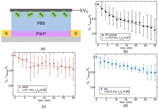 Theoretical modeling was conducted based on the results of the BSA + human IgG control experiment, which was measured in 1X PBS using the S-OECT platform [], which only has one functionalized gate and exhibits appreciable current drift. The structure of the S-OECT platform is indicated in Figure 1a. The first type of bioreceptor layer that we studied was PT-COOH, which is a p-type semiconducting polymer. Figure 1b illustrates the experimental and theoretical data for PT-COOH-incorporated biosensors. The experimental data are indicated by symbols with error bars, and the theoretical lines were obtained by fitting an exponentially decaying function (derivation provided below). At each subsequent experimental data point, the concentration of human IgG was ten times greater than for the previous point. However, in the absence of antibodies, the IgG was assumed to be irrelevant, and we hypothesized that the drift was only caused by small ions. Experiments without the presence of IgG will be discussed below. Figure 1c,d demonstrates the results using different bioreceptor layers, an insulating polymer poly (styrene–co–acrylic acid) (PSAA), and a self-assembly layer (SAL) []. The theoretical model was the same for all three types of bioreceptor layers; only the parameters changed.