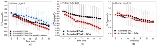 Current drift for various OECT configurations. (a) PT-COOH-incorporated biosensors with PBS changing steps, activated PT-COOH-incorporated biosensors, and activated PT-COOH + BSA-incorporated biosensors. (b) Activated PSAA-incorporated biosensors and activated PSAA + BSA-incorporated biosensors. (c) Activated SAL-incorporated biosensors and activated SAL + BSA-incorporated biosensors. The solid curves show the theoretical fit with parameters τ and Is (Equation (11)).