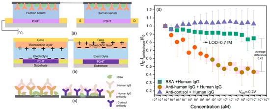 Furthermore, we investigated the performance of the double-gate (D-OECT) platform in real human fluid with poly [3-(3-carboxypropyl)thiophene-2,5-diyl] regioregular (PT-COOH) used as a bioreceptor layer with immobilized IgG antibodies. IgG in human serum was used as the target biomolecule to keep the species of the binding biomolecules consistent with our previous experiment in a phosphate-buffered saline (PBS) solution [,], thus enabling a quantitative comparison of the device sensing performance between PBS and human serum. Because human IgG is abundant in human serum, the biological fluid chosen for detection was human IgG-depleted human serum []. The reason for depleting the original human IgG in the human serum was to control the accuracy of the concentration of the human IgG in the system during the measurement.
