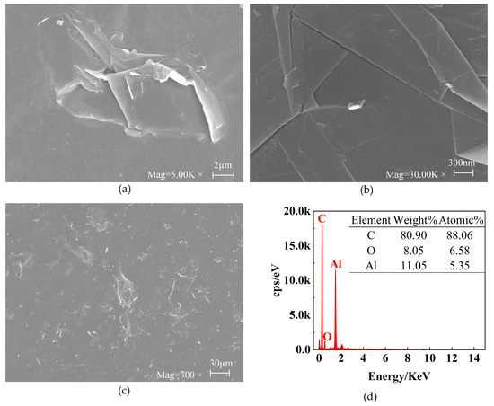 Furthermore, the EDS patterns of CS-GNs nanocomposites are depicted in Figure 2d. From the patterns, it is evident that the main elements detected include C, O, and Al elements. Among them, the weight percentage of element C was 80.90%, with an atomic percentage of 88.06%; the weight percentage of the element O was 8.05% and the atomic percentage was 6.58%; and the weight percentage of element Al was 11.05% and the atomic percentage was 5.35%. Since tin foil was utilized as the substrate for the SEM inspection of CS-GNs nanocomposites, and the predominant element in tin foil paper is aluminum, a significant peak of aluminum is observed in the EDS pattern. These results showed that the CS-GNs nanocomposites were successfully prepared.