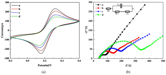 To examine the characteristics of the immunosensor interface, experiments were conducted using CV and EIS methods. The base solution consisted of 0.2 M PBS containing 5.0 mM K3[Fe(CN)6] and 0.1 M KCl. Figure 4 shows the CV and EIS scan the results of different modified electrodes: bare CS-GNs/GCE (curve a), anti-AFB1/CS-GNs/GCE (curve b), BSA/anti-AFB1/CS-GNs/GCE (curve c), and AFB1/BSA/anti-AFB1/CS-GNs/GCE (curve d).