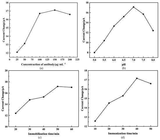The pH value of the base solution was a crucial parameter, potentially resulting in protein denaturalization or the instability of the immunosensor [33]. Figure 5b illustrates that the peak current change () gradually increased with the pH value of the base solution increased, reaching its peak at 7.0. This happens because extreme acidity or alkalinity can damage the immobilized protein, especially under alkaline conditions [34]. As a result, the pH value of the base solution was adjusted to 7.0 for further investigation.